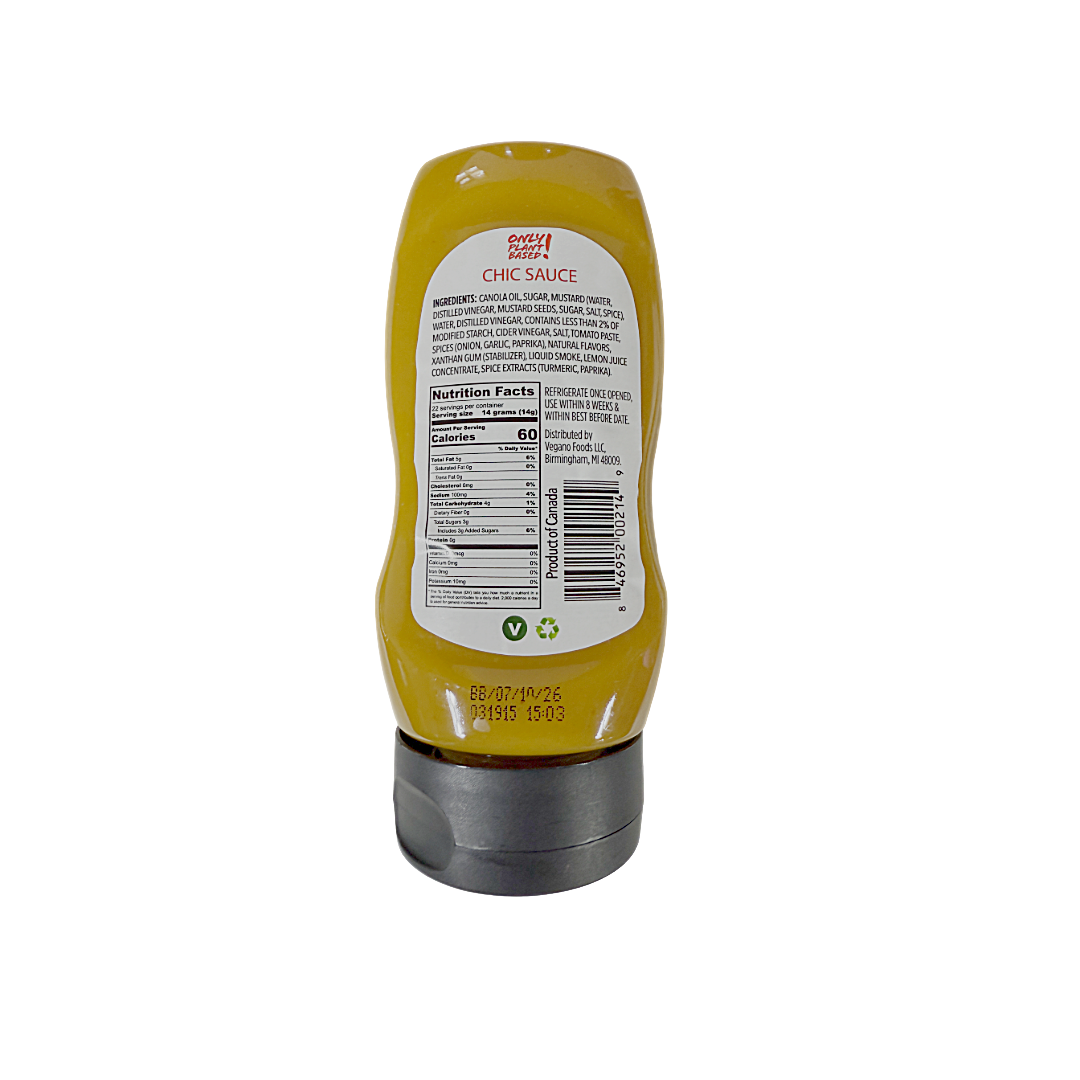 Introducing the deliciously familiar Only Plant Based! Chic Sauce — a tantalizing blend of canola oil, sugar, mustard, vinegar, tomatoes, and spices. Free from soy, gluten, and dairy, this sauce adds a familiar crave-able flavor to your dishes, containing only 60 calories per tablespoon-sized serving